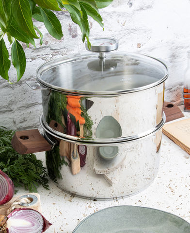Le BIOME contient une casserole Multiply de la collection Casteline pour une conservation optimale de la chaleur, un cuit-vapeur tout inox, un couvercle en verre amovible (à utiliser avec une poignée amovible pour une préhension sans risque de brûlure), un thermomètre de contrôle pour une cuisson précise, ainsi que deux anses amovibles Mutine disponibles en 8 couleurs ou en bois massif de la collection Casteline.